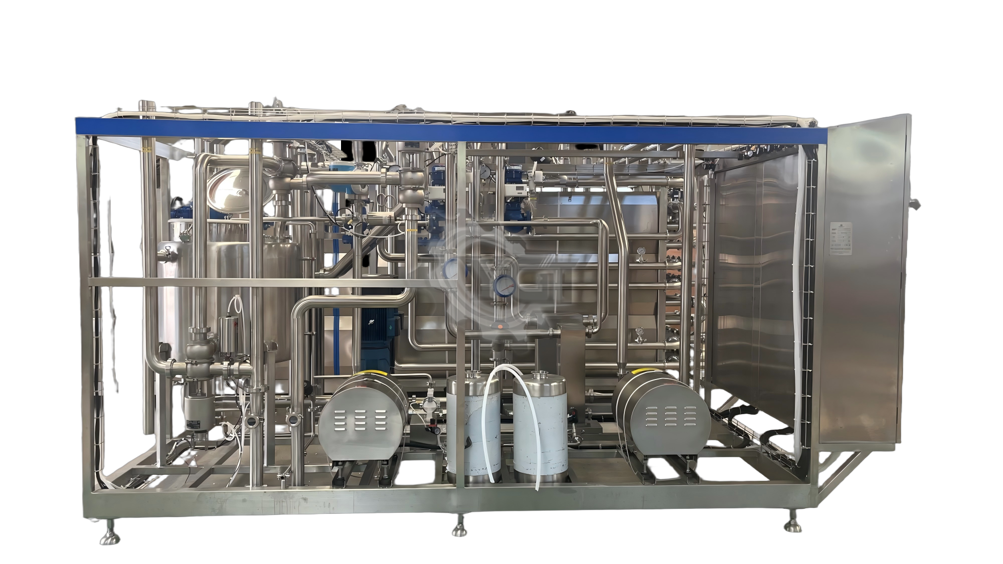 The 13T/H Tubular Sterilizer is designed for the liquid food and beverage industries, including juice, dairy, and plant-based drinks. This high-performance sterilizer ensures product safety, extends shelf life, and maintains the original flavor and nutritional value. It features a dual hot water system for stable and continuous sterilization, precise temperature control with a PID system, and a fully automated PLC control panel with a user-friendly interface. The sterilizer’s split design makes it easy to operate and maintain, while the sanitary components (INOXPA pumps and valves) ensure high hygiene standards. This system is ideal for large-scale production, offering a reliable, efficient solution for modern food and beverage processing.